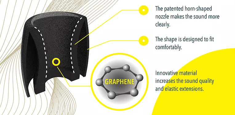 Horn-Shaped Tipsは、 最適なグラフェンとシリコンの配合比を使用することで、 耐久性や安定性を犠牲にすることなく最高クラスの快適性を実現しています。グラフェンを最適な分量で配合することで、従来製品よりも柔らかいシリコンを使用することが可能となり、快適な装着性と長期間の耐久性を両立させることに成功しています。